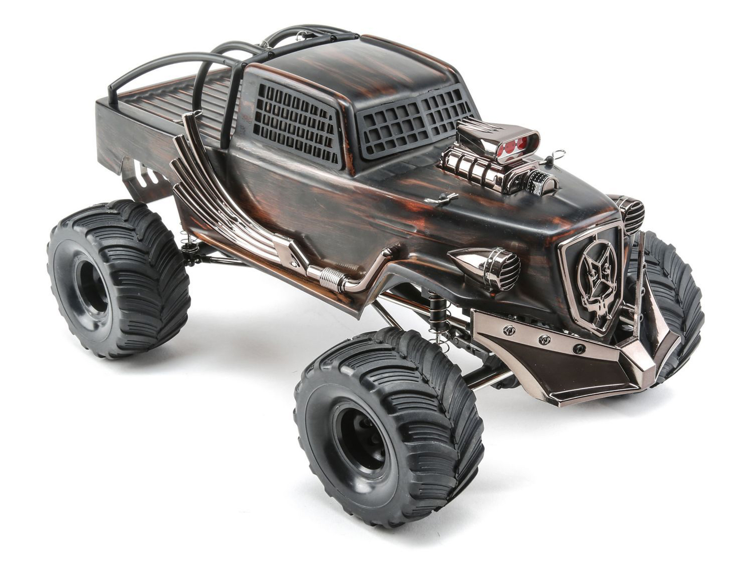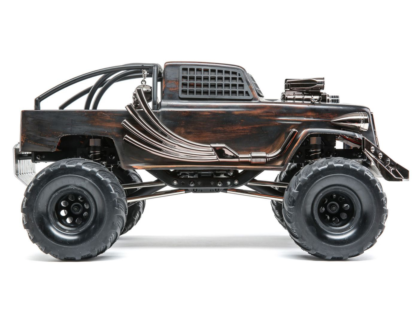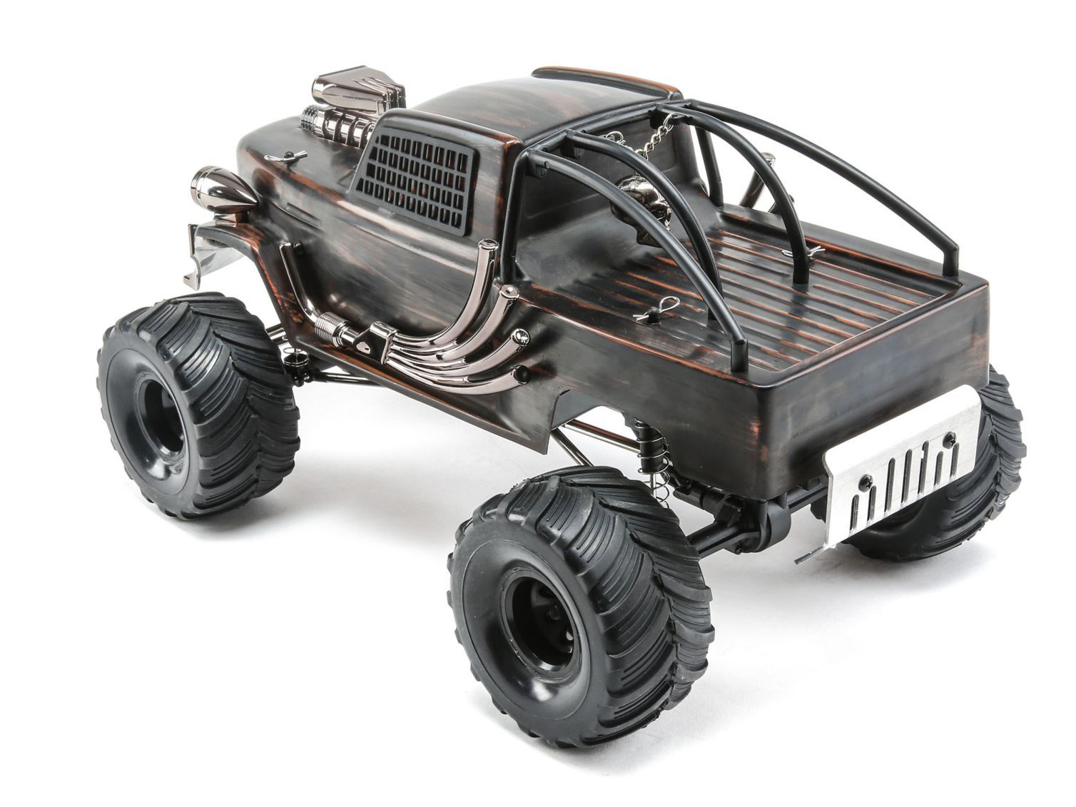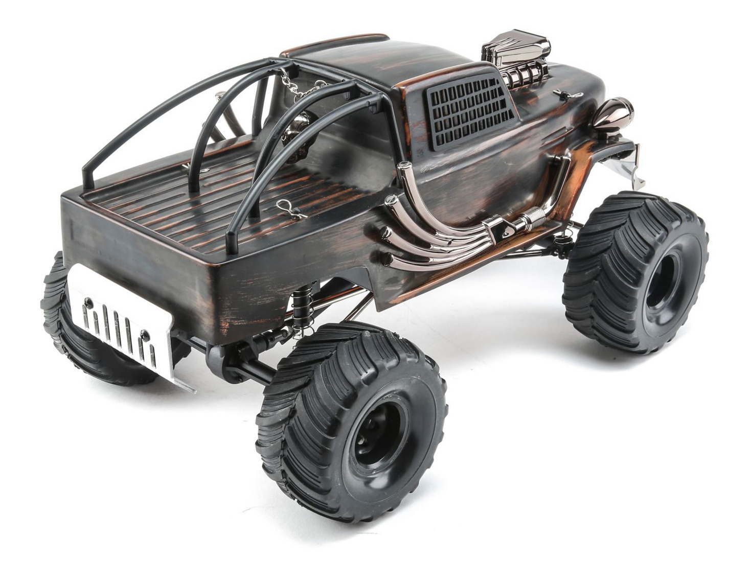 Taking its cue from the impressive ECX® Barrage®, the ECX® 4WD Barrage Doomsday™ commands your attention and seals the deal with incredible features such as 4WD drive train, 4-link suspension, high torque 390-size motor, waterproof electronics, scale monster truck wheels and tires, and a post apocalypse style body with LEDs. With the Barrage Doomsday, you get a level of realism unmatched by other similarly priced vehicles. New drivers will love the incredible patina finish, composite roll cage, engine, exhaust, and LED lights. This virtually indestructible vehicle can go anywhere including tall grass, woods, mud, as well as your neighborhood creek and can clear rocks easily. Plus, you get all of this excitement without breaking your budget or your drive train.