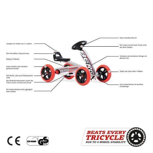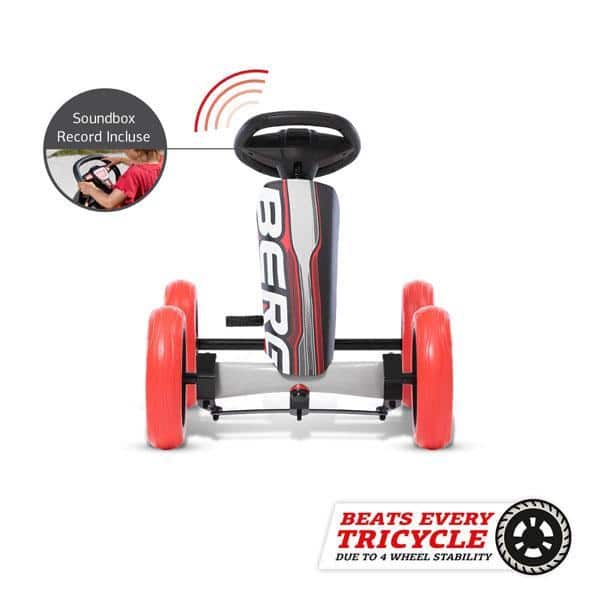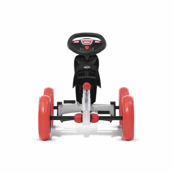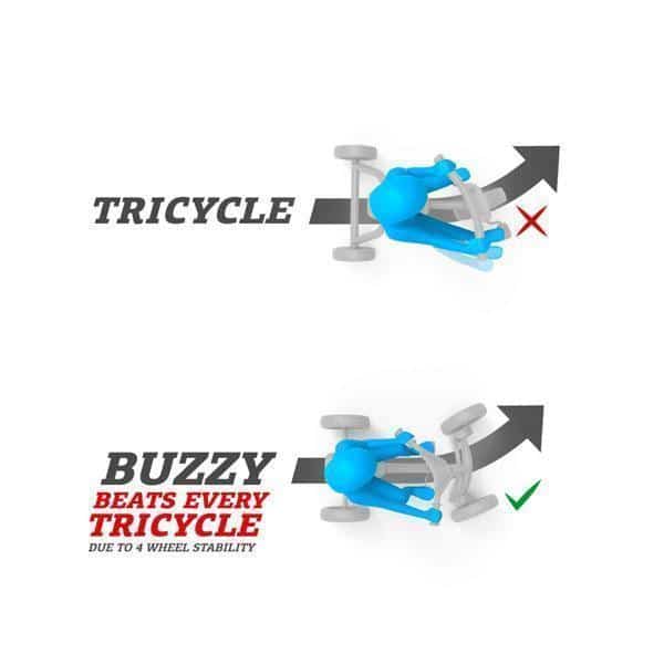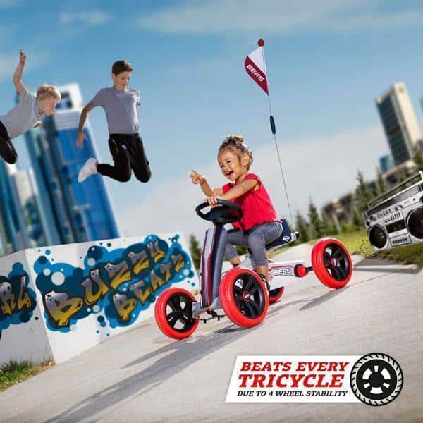 This Buzzy Go Kart is safe and more stable than a standard tricycle because of it’s four wheels. You can speed round corners whilst your feet stay firmly planted on the pedals as these are not attached to the steering wheel.