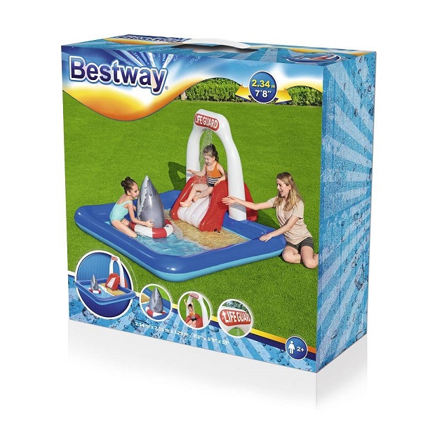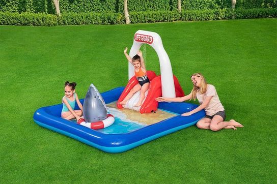 Look out for that Shark!Its ok, he only wants to enjoy the summer fun along with everyone else.The new Bestway 53079 Lifeguard Tower Paddling Pool is the perfect way for younger children to do just that.The removable inflatable slide is the fun way to get into the splash pool while the water sprayer will keep you cool as you play and don’t worry about the shark he’s super friendly we promise, he just wants to float around and keep you company as you play.