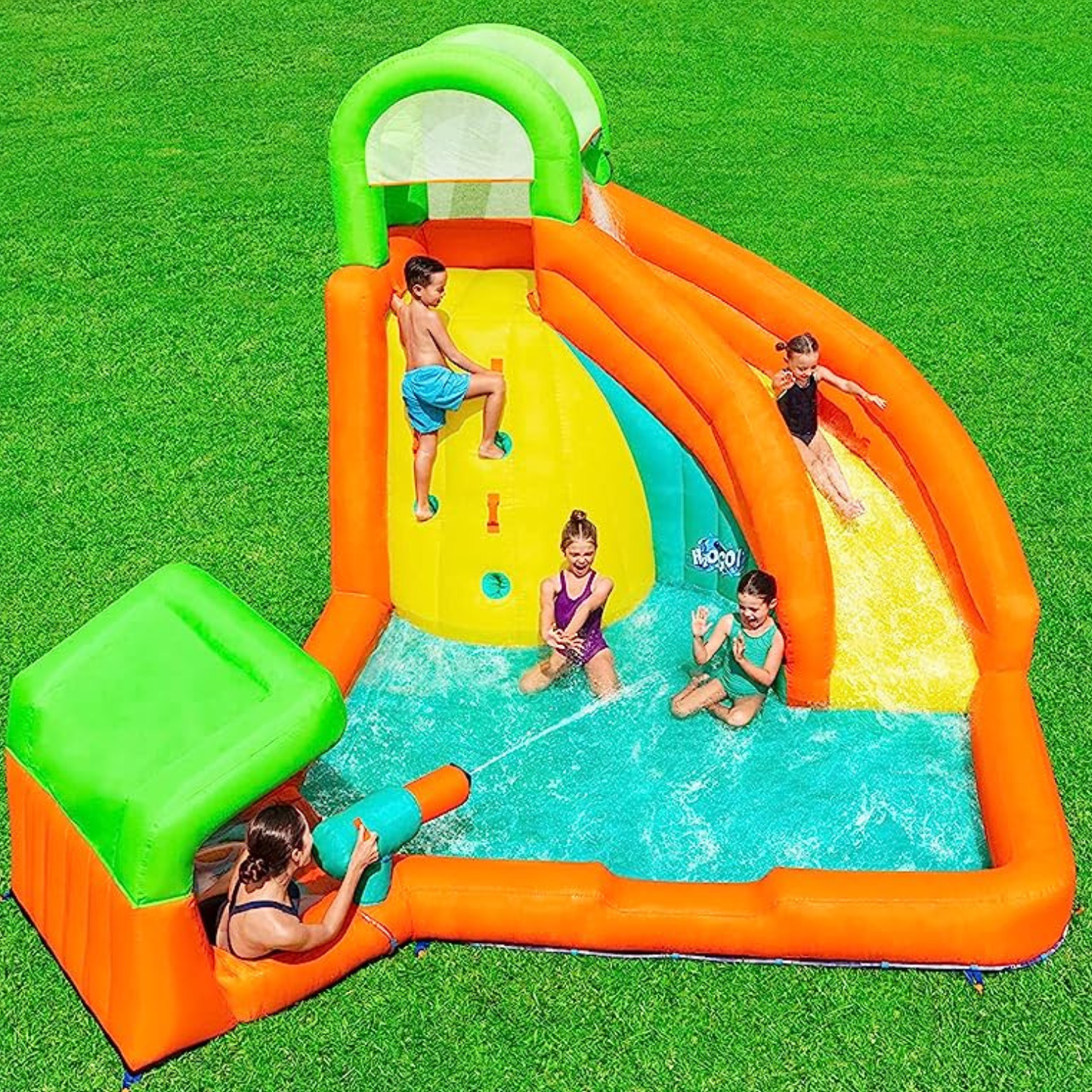 Let your kids climb, slide, and navigate their very own water park and take aim with the Point ‘n Spray Water Cannon! They can take their adventure to new heights as they scale the climbing wall and then slide down the slippery, twisty curved slide into the large splash pool.