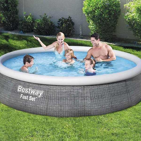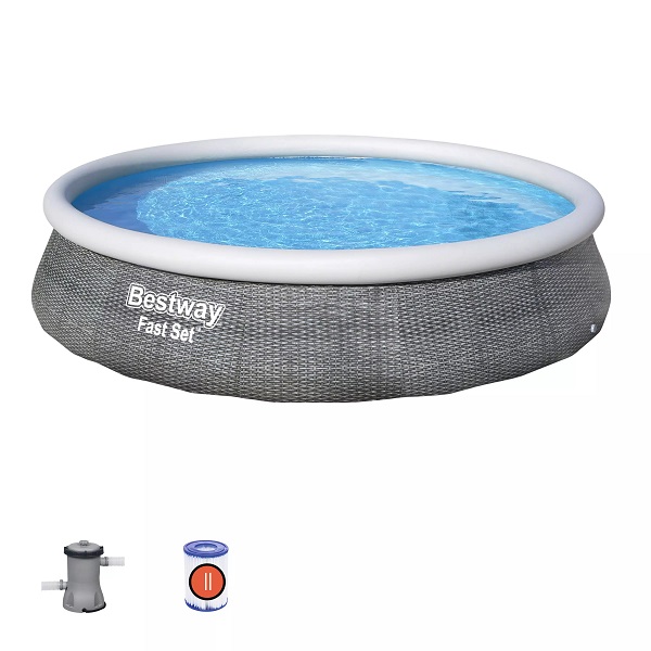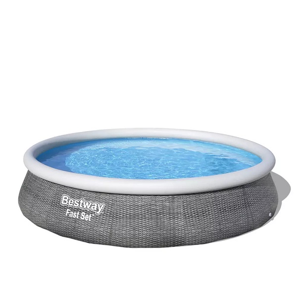 The Bestway 57376 13ft Fast Set Swimming Pool is from Bestway’s renowned range of quick and easy to set-up above ground pools.Unlike in-ground swimming pools, which require weeks of tough digging, Fast Set™ inflatable swimming pools simply require a flat surface, water access and an hour of your time to set up.Built to be tough, the Bestway 57376 13ft Fast Set Swimming Pool has been made from heavy-duty PVC and the side walls have been constructed from separate layers of material.Simply inflate the top ring and watch the pool rise as it is filled with water.Dimensions:Brand: BestwayRange: InflatableShape: RoundProduct Diameter (13ft) – 3.96mProduct Height (33in) – 84cmWater Capacity: 7340L-Contents Include: