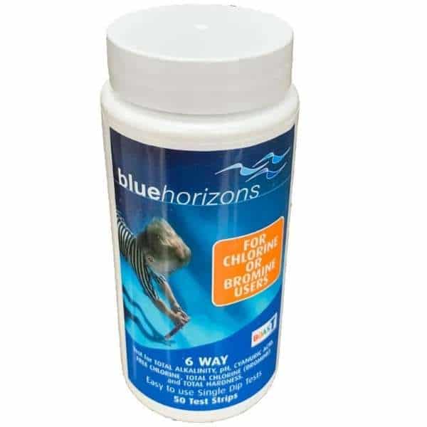 Blue Horizons 6-Way Test Strips provide a quick and easy way to test your swimming pool water. These test for free chlorine, total bromine, pH, total alkalinity, calcium hardness & cyanuric acid.