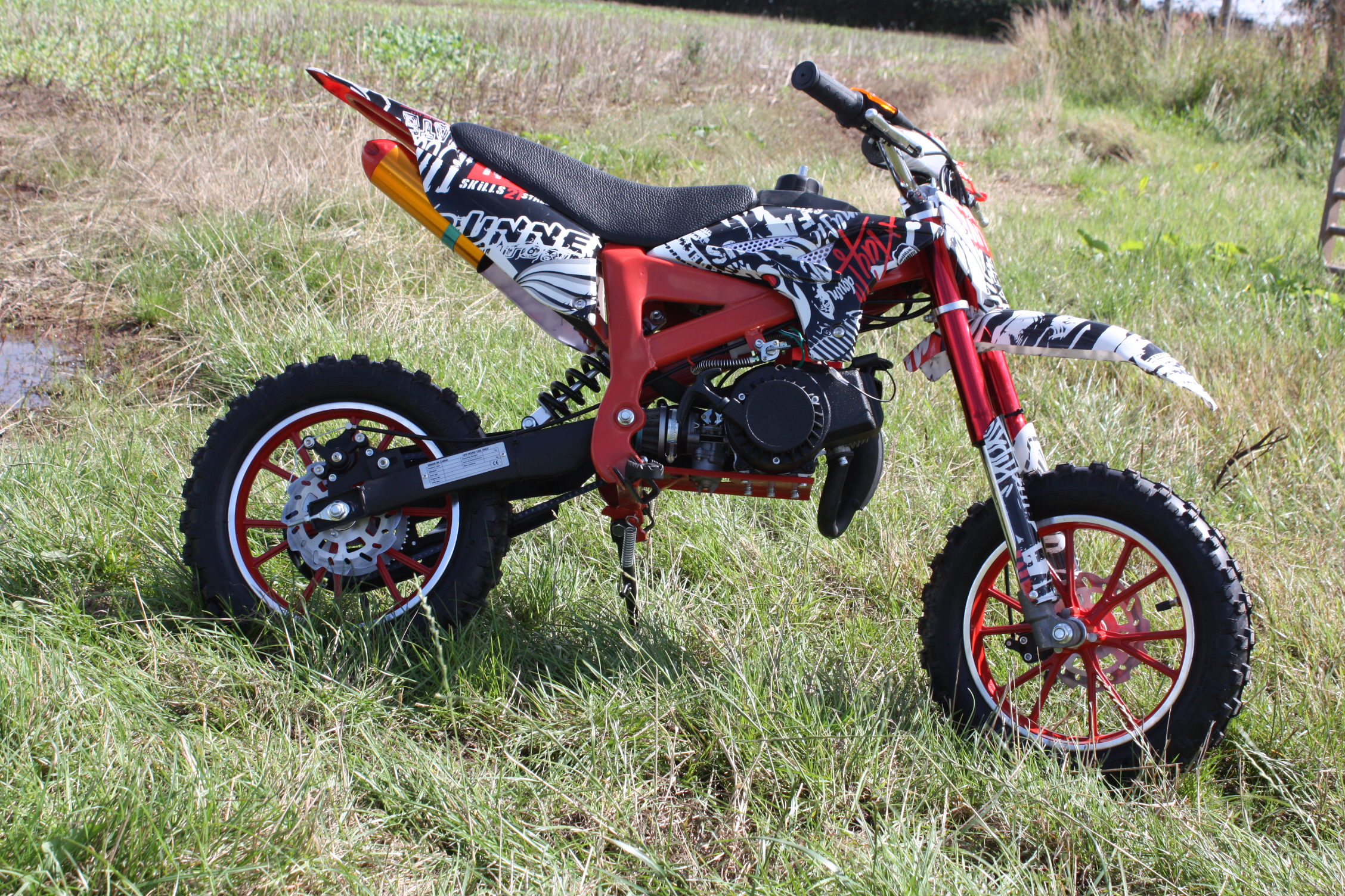 Quality built to European safety standards these Mini Moto 50cc Mini Dirt Bikes have important safety features that you do not find on all Mini Motos Mini Dirt Bikes including, Safety Cut-Out with tether to stop the bike should the rider become unseated, Chain Guard to stop clothing or other items coming into contact with the transmission and front and rear independent disk brakes.