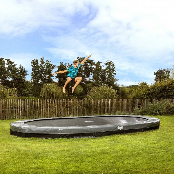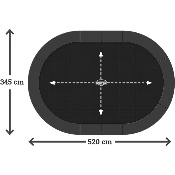 The Berg Grand Elite 520 Inground Trampoline Grey is the ultimate oval trampoline!Its sturdy protective edge is made of robust material making the BERG Elite trampoline suitable for intensive use.The Berg Grand Elite 520 Inground Trampoline Grey conceals itself in to your garden and being ground level easily accessible.The protective edge is also extremely UV resistant.The Berg Grand Elite 520 Inground Trampoline Grey features TwinSpring Gold springs and the unique AirFlow jumping mat for the ultimate effortless jumping comfort.The AirFlow jumping mat provides 50% more airflow which guarantees less resistant, comfortable higher jumping.The Berg Grand Elite 520 Inground Trampoline Grey is a sports trampoline but the Safety Net Deluxe is available to purchase if required.The Deluxe Net XL enclosure is also available for this model and features an extra 22% in height from the regular deluxe which means it is even more safe, It has a self-closing fastening entrance to accommodate easy access.The unique arched surround at the top of the net provides extra safety and makes certain that the trampoline always looks perfect.Trampoline FrameThe Berg Grand Elite 520 Inground Trampoline Grey boasts round 48mm x 2mm gauge galvanised steel frame covered by a 10 year warranty against rust causing failureThe frame is formed with welded slots, so no nuts and bolts make for easier construction.Locking legs and feet make for easy manoeuvre.Berg Deluxe Safety Enclosure:8 upright poles each covered in a long-lasting protective sleeve.Trampoline Bed:The Berg Grand Elite 520 Inground Trampoline Grey is weatherproof, soft surface UV stabilised, polypropylene woven mesh mat with multiple lines of perimeter stitching.The mesh allows for easy drainage, so perfect for outdoor use.Frame Pads:TrampolineThe Berg Grand Elite 520 Inground Trampoline Grey is finished off in a heavy grade PVC and benefits from a 5 year warranty! These pads are 30mm thick pads are made from closed cell foam to exclude water.The Pads have a heavy layer of PVC which will last much longer than inferior PE.The pads are 40cm wide to safeguard jumpers so there is no chance of landing on any exposed part.The Pads tie securely to the frame of the trampoline to ensure they stay in the correct position.The padding covering is also UV treated to protect against harmful rays from the sun.Trampoline SafetyOnly one person at a time on the trampoline.Multiple jumpers increase the risk of injury.Do not perform somersaults as these can cause paralysis or death if you land on your head or neck.Adult supervision is recommended at all timesFor added safety measures, please leave a 2m around your trampoline.
