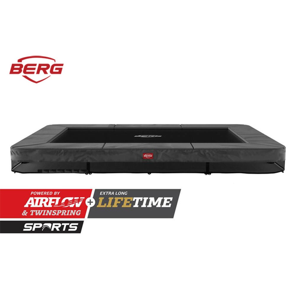 The Berg Inground Ultim Champion 330 Trampoline Grey is designed to ensure that you can jump safely and for a longer period of time on an excellent trampoline.The advantage of a rectangular trampoline compared with a round trampoline is that you can jump over the entire length. Due to its shape, the trampoline fits in almost any garden, even that smaller garden!The combination of the TwinSpring Gold springs with the AirFlow jumping mat ensures less air resistance and a larger jumping surface. Together, this makes for better and higher jumps.As the Berg Inground Ultim Champion 330 Trampoline Grey is sunken into the ground, it is easier to step onto and it is also nicely concealed in the garden so doesn’t spoil your surrounding view.The Berg Inground Ultim Champion 330 Trampoline Grey is the sports version however the The Net Deluxe can be included if preferred.Trampoline FrameThe Berg Inground Ultim Champion 330 Trampoline Grey boasts round galvanised steel frame is covered by a 10 year warranty against rust- causing failure. The legs and feet of the trampoline are powder coated.The frame is formed with welded slots, so no nuts and bolts make for easier construction. Locking legs and feet make for easy manoeuvre.Trampoline Bed:The Airflow design makes jumping more effortless than for a standard bed.The Berg Inground Ultim Champion 330 Trampoline Grey has a weatherproof, soft surface UV stabilised, polypropylene woven mesh mat with multiple lines of perimeter stitching.The mesh offers easy drainage and is therefore perfect for outdoor use.Frame Pads:The 30mm thick PVC with a 2 year warranty made from closed cell foam to exclude water.The benefit from an extra heavy layer of PVC which will last much longer than inferior PE.The pads measure 40cm wide and safeguard jumpers to ensure there is no chance of jumpers landing on any exposed part.The Pads tie securely to the frame of the Berg Inground Ultim Champion 330 Trampoline Grey to ensure they are always in the correct position.The padding covering is also UV treated to protect against harmful rays from the sun.Trampoline Safety:Only one jumper on the trampoline at any time.Multiple jumpers increase the risk of injury.Do not perform somersaults. Paralysis or death may result if you land on your head or neck.We recommend adult supervision at all times.For added safety measures, please leave a 2m around your trampoline.