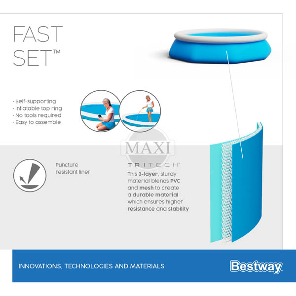 Specifications for Bestway 57268 8Ft Round Inflatable Fast Set Pool:Extra strength side walls are made with 3 separate layers of materialThe inner layer of polyester mesh is laminated to the 2 outer heavy gauge PVC layers.Total thickness of 0.40-0.80 mm (16-32 gauge) depending on the size of the pool Bestway 57268 8Ft Round Inflatable Fast Set Pool