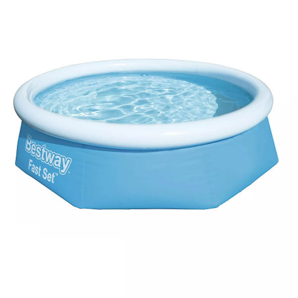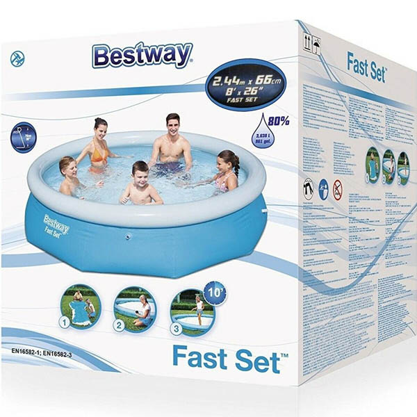 Bestway 57268 8Ft Round Inflatable Fast Set Pool is an incredibly practical swimming pool for the garden because it can be set up and packed away in next to no time.Its circular shape makes it perfect for swimming practice whilst its size provides ample space for summer parties.Setting up the above ground pool simply requires a flat, solid surface, an air pump and water access.One of the benefits of having a swimming pool above ground as opposed to in-ground is that there?No need for weeks of digging and a total transformation of your once green and pristine garden.Forget about breaking into a sweat; this little baby can be up and running in well under an hour!To set up the Bestway 57268 8Ft Round Inflatable Fast Set Pool you simply spread it out onto a suitable spot, inflate its stylish, see-through top ring and fill its blue base with water.As the Fast Set Swimming Pool fills up with water its durable blue shell broadens out and rises until it has reached its finished shape.The hard wearing outer wall is made by sandwiching polyester mesh between tough, heavy gauge PVC layers, guaranteeing watery fun for season after season. Dimensions:Brand: BestwayRange: InflatableShape: RoundProduct Diameter: (8ft) – 2.44mProduct Height: (26in) – 0.66mRecommended Water Depth: 0.53mWater Capacity: 2,300L Product Includes: