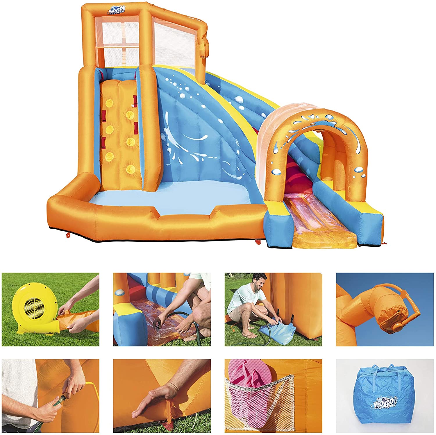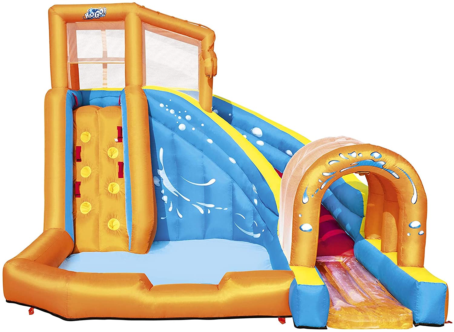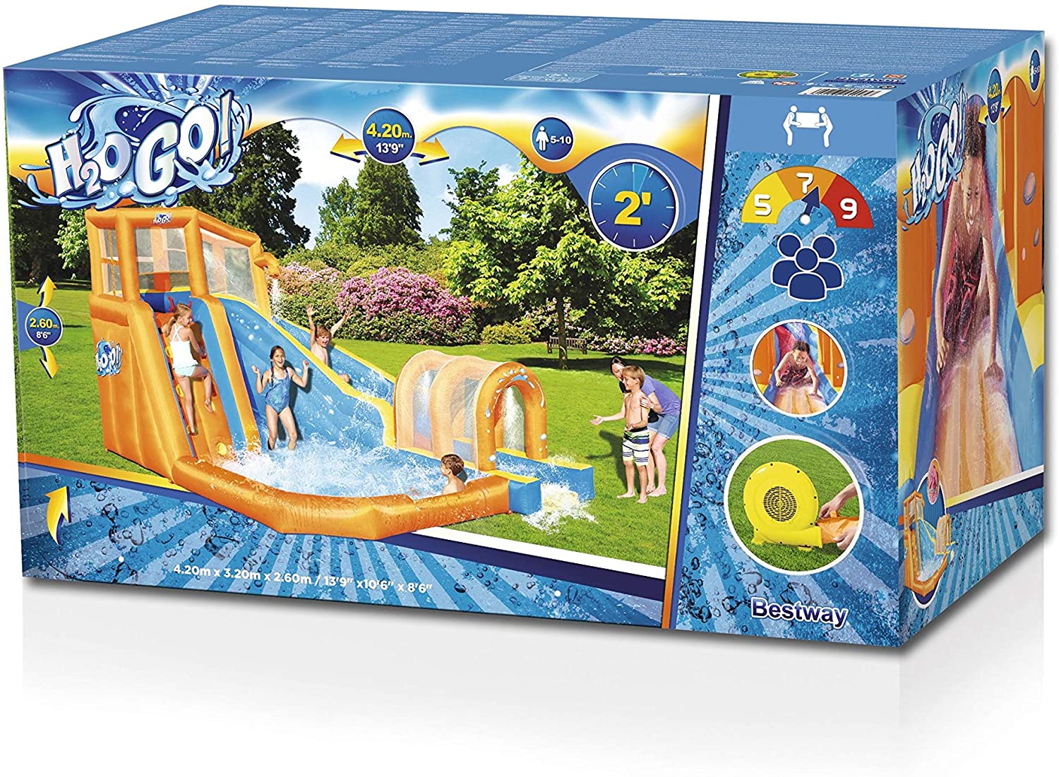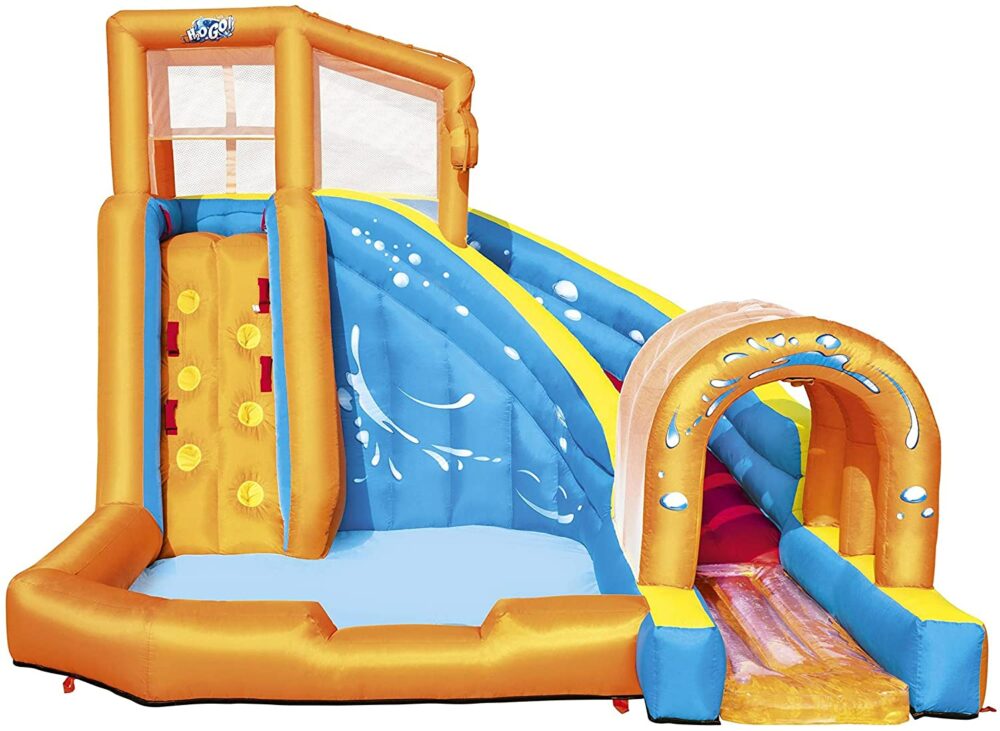 Bestway Hurricane Tunnel Water Slide is an extravagant play area for climbing, slipping and more. The park features a climbing wall with grips and support points for an advanced climbing level. Once children reach the top of the climbing wall, they are protected by a special mesh safety wall. Mesh walls provide safety without hindering climbing or sliding. Jump through the curved slide and enjoy a special surprise: land on a water platform. The water platform allows for smooth landing when children slide through the spraying tunnel. The spray tunnel sprays water constantly to keep the park wet and refresh children. The base of the park is a large playground pool where children can relax or slide before starting climbing and sliding. Use the mesh shoe storage area to keep shoes dry and conveniently located. he park complies with all safety standards, as the PVC coated polyester material is durable, but provides a comfortable and pleasant feeling for children. The powerful 110-120V/220-240V/110-120V electric inflator with Gfci safety plug inflates the water park in less than two minutes; made of PVC coated polyester, durable and colourful; quick and easy installation. With the high power blower, the Bestway Hurricane Tunnel Water Slide swells in less than 2 minutes; strong curved slide, to glide securely; Built-in shower system keeps you wet; Shower fountain for the fun never ends; you will be sprayed while you go through the tunnel; Water Mat provides fun, soft and safe landing; Comes with a large pool area climbing wall with 4 handles and 6 steps – a secure mesh cover surrounds the top of the tower -side mesh for storing shoes -includes a heavy duty repair patch for any untimely puncture; designed exclusively for outdoor use.