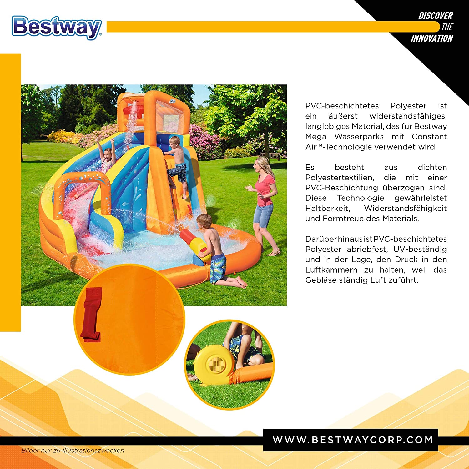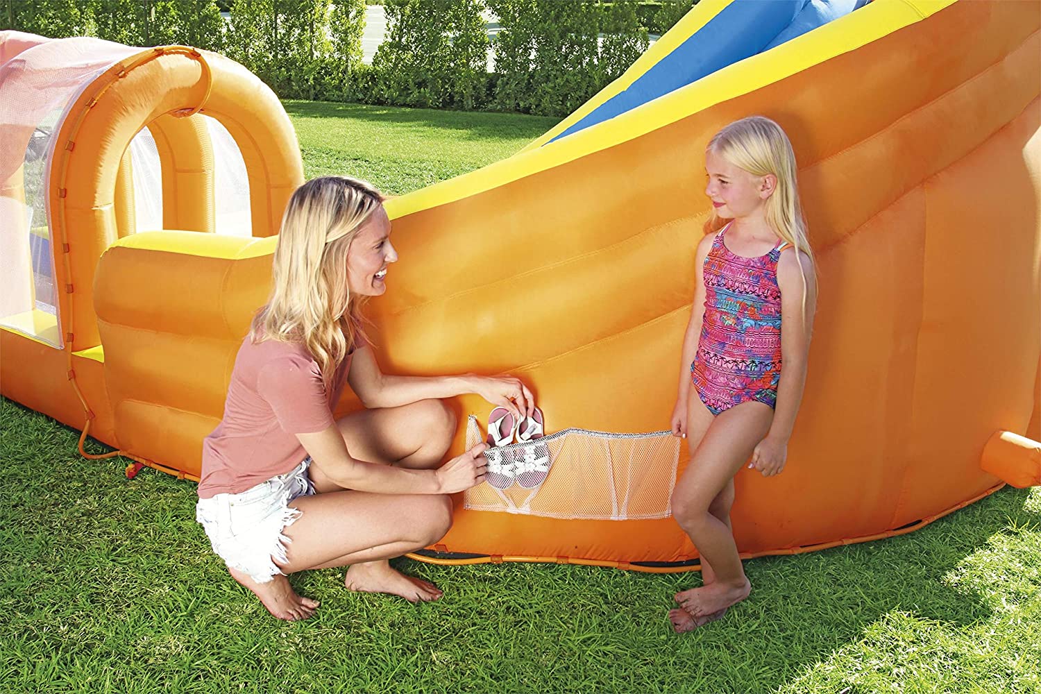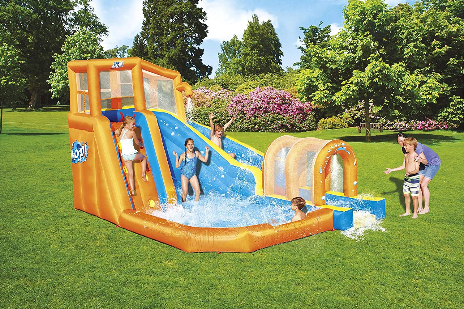 Bestway Hurricane Tunnel Water Slide is an extravagant play area for climbing, slipping and more. The park features a climbing wall with grips and support points for an advanced climbing level. Once children reach the top of the climbing wall, they are protected by a special mesh safety wall. Mesh walls provide safety without hindering climbing or sliding. Jump through the curved slide and enjoy a special surprise: land on a water platform. The water platform allows for smooth landing when children slide through the spraying tunnel. The spray tunnel sprays water constantly to keep the park wet and refresh children. The base of the park is a large playground pool where children can relax or slide before starting climbing and sliding. Use the mesh shoe storage area to keep shoes dry and conveniently located. he park complies with all safety standards, as the PVC coated polyester material is durable, but provides a comfortable and pleasant feeling for children. The powerful 110-120V/220-240V/110-120V electric inflator with Gfci safety plug inflates the water park in less than two minutes; made of PVC coated polyester, durable and colourful; quick and easy installation. With the high power blower, the Bestway Hurricane Tunnel Water Slide swells in less than 2 minutes; strong curved slide, to glide securely; Built-in shower system keeps you wet; Shower fountain for the fun never ends; you will be sprayed while you go through the tunnel; Water Mat provides fun, soft and safe landing; Comes with a large pool area climbing wall with 4 handles and 6 steps – a secure mesh cover surrounds the top of the tower -side mesh for storing shoes -includes a heavy duty repair patch for any untimely puncture; designed exclusively for outdoor use.
