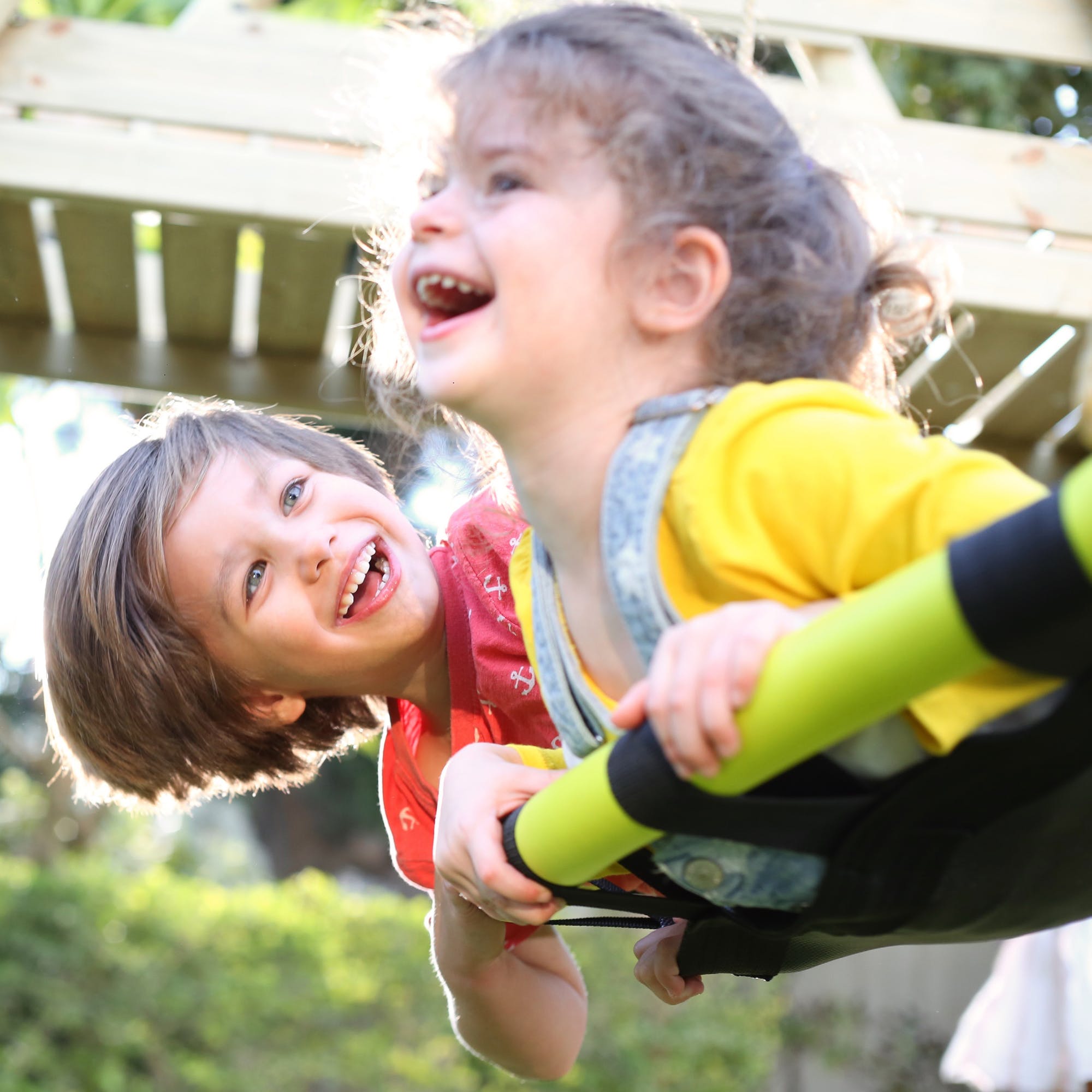 Rugged and rustic, this Double Round wood swing frame with Deck and Slide is sold complete with a fun Nest Swing