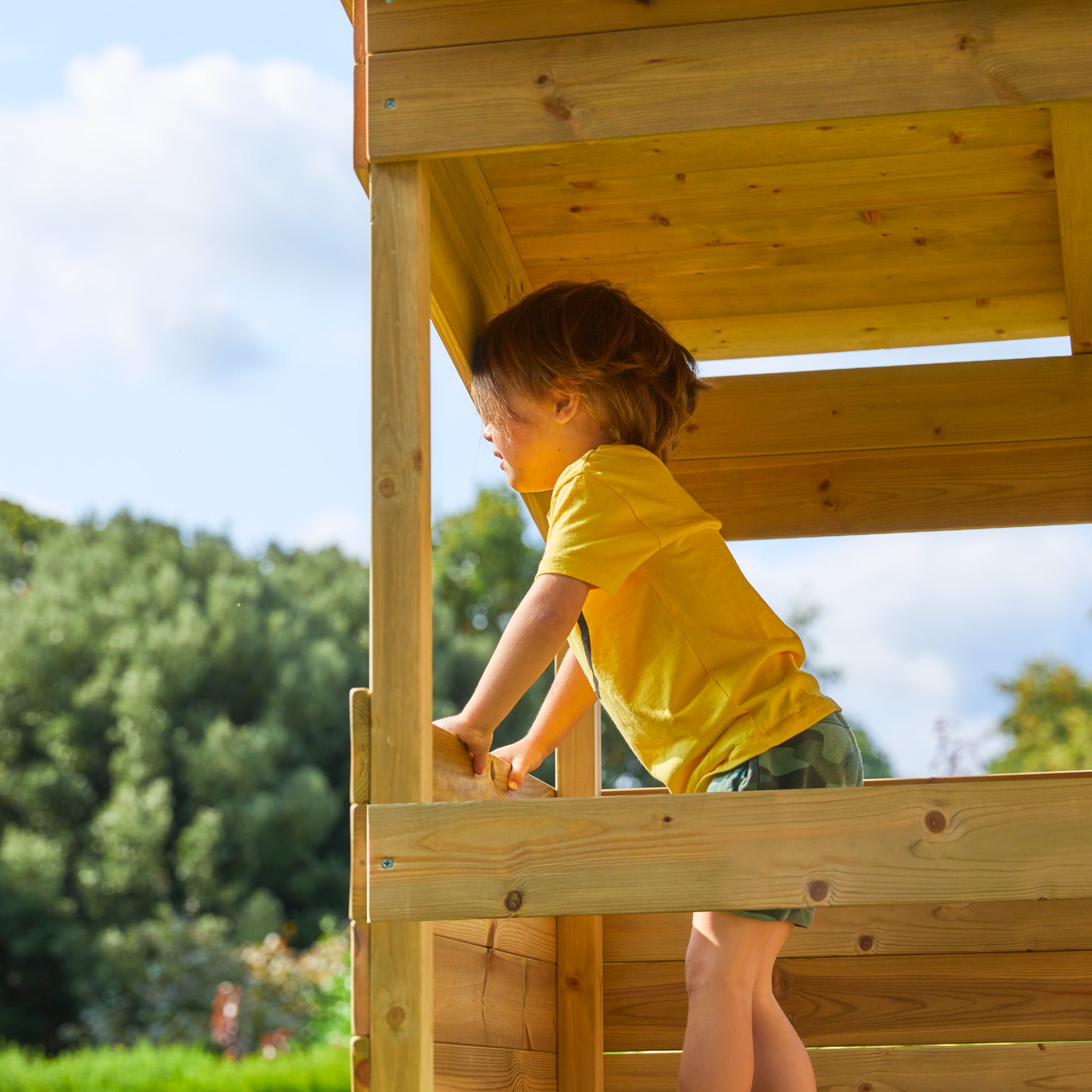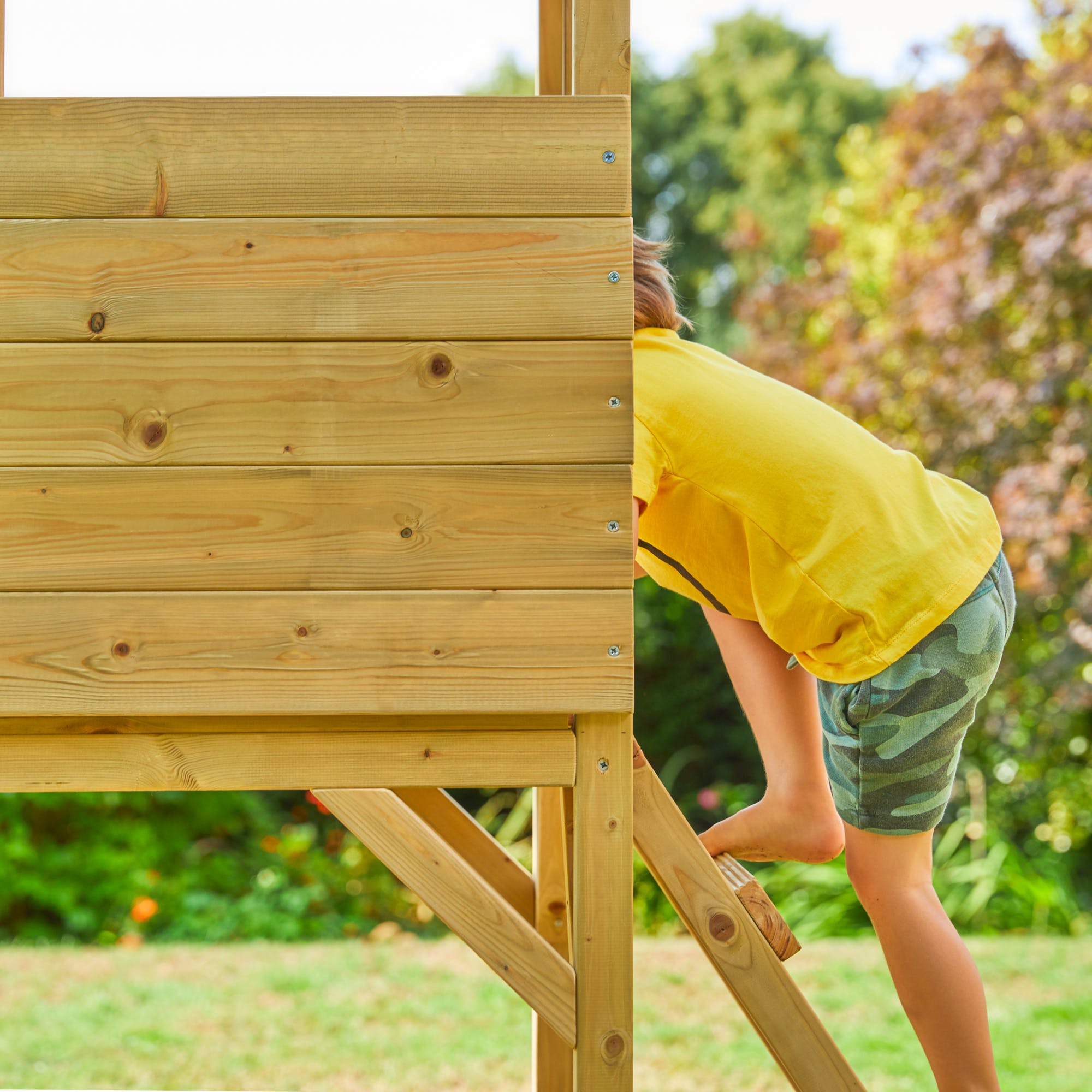 - Children access the very roomy lookout deck by climbing the wooden ladder.